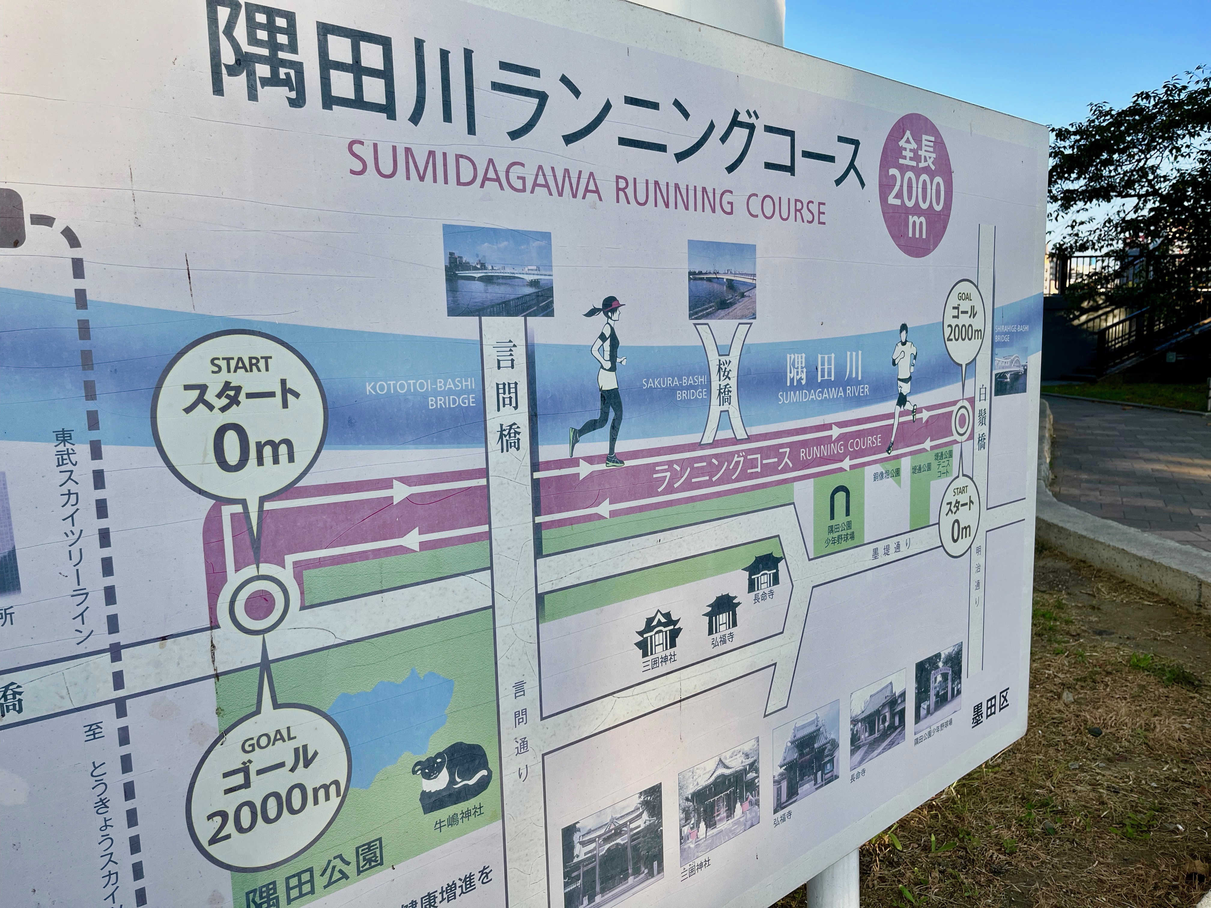 休日の朝、7時に家を出て隅田川の川べりのランニングコースを2キロ歩きます。
