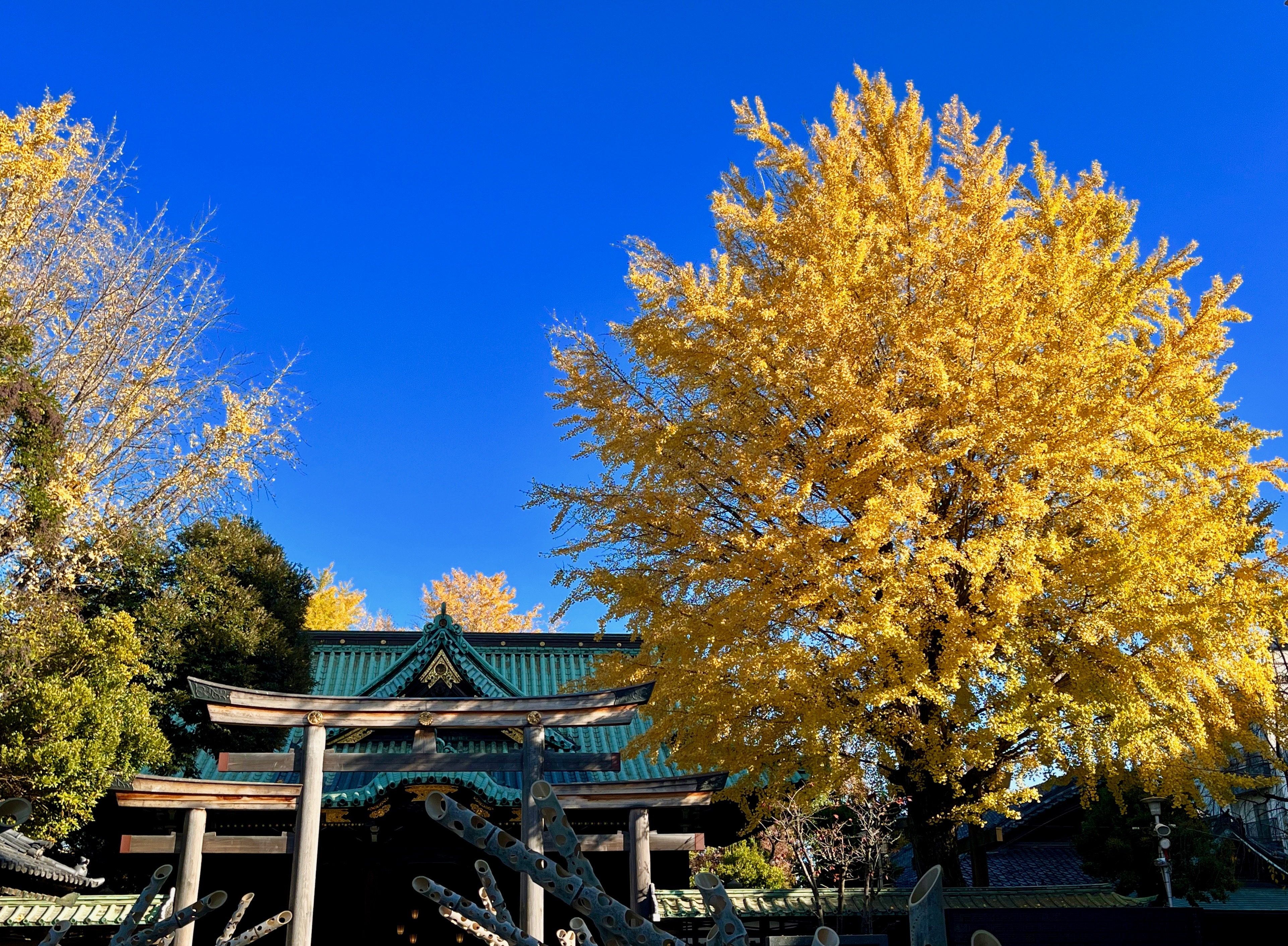 遠くに見えるのは牛嶋神社の銀杏の木。目が醒めるほど鮮やかな葉を湛えています。